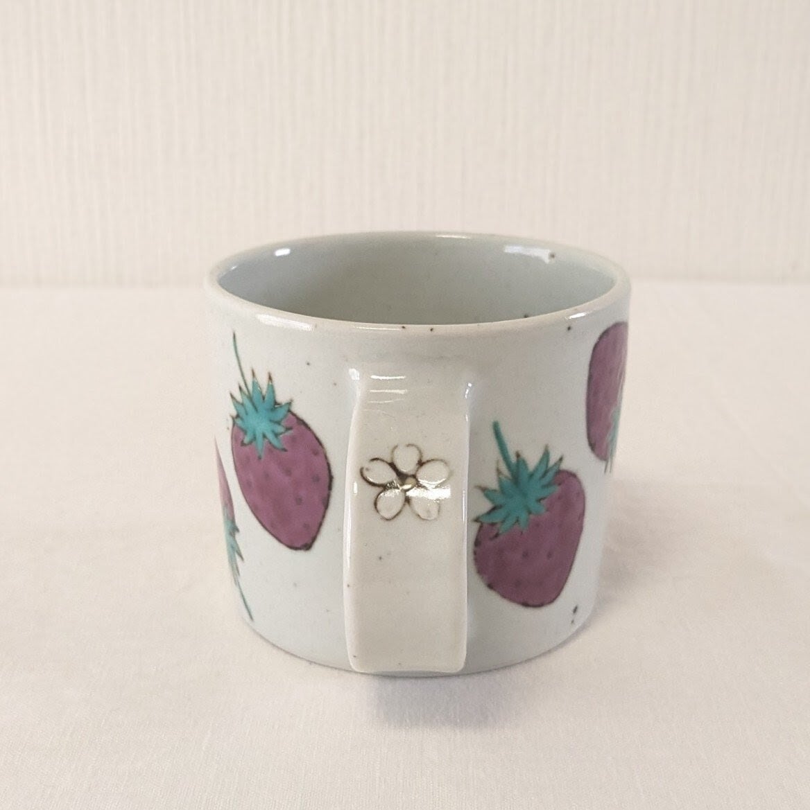 工房で土から一つずつ制作していて作り始めた当初から人気のロングセラーの苺デザインは、大人可愛い透明感あるルビーピンクの色合いが視覚的にも楽しませてくれ、ほっこり癒しの自分時間、苺好き、ビジュアルにも拘る方々にも映えて楽しめるデザインです。